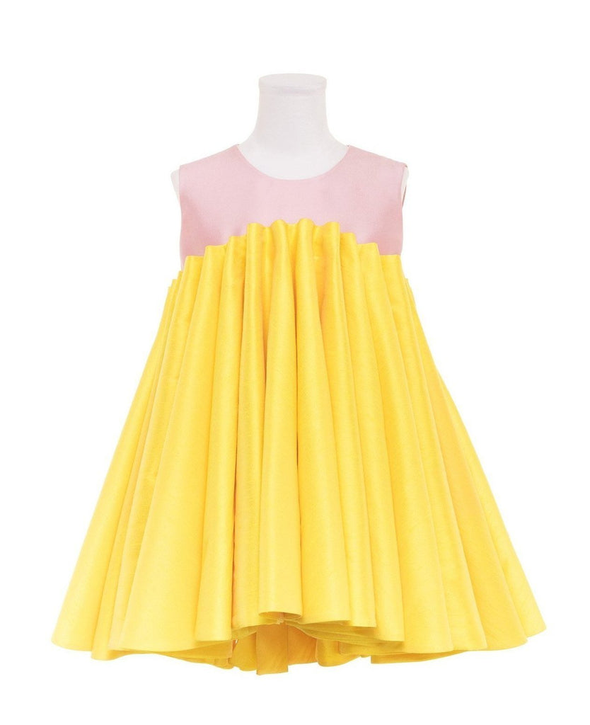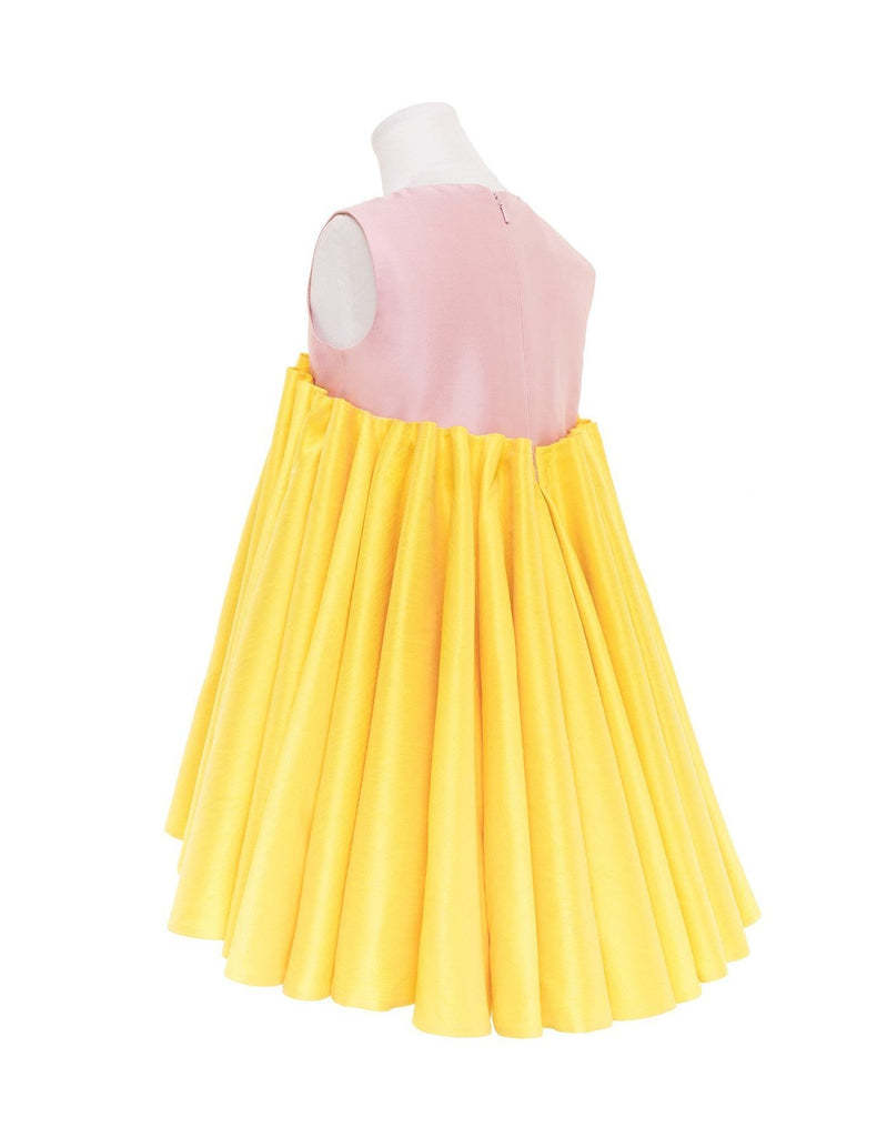 Blush pink satin taffeta bodice with yellow shantung empire A-line skirt created with stacked-up vertical cones. The skirt has a high-low hem and hidden pockets.