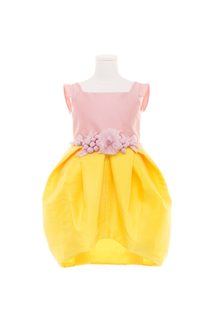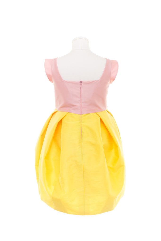 Blush pink satin taffeta bodice with narrow cuff sleeves and a yellow shantung deep pleated tulip skirt with hidden pockets.