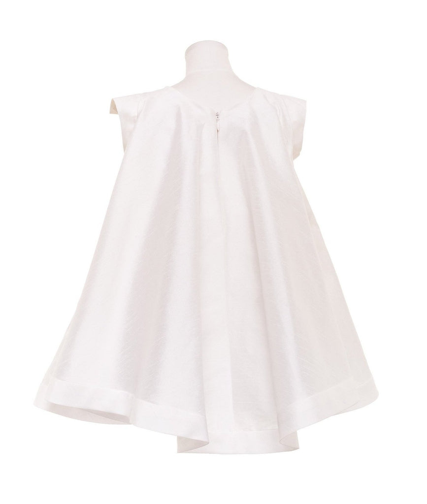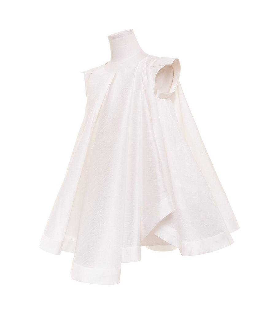 White shantung tunic dress with deep pleats along the neckline and shaped capped sleeves. It includes hidden pockets and a band trimmed along the cascading hem.