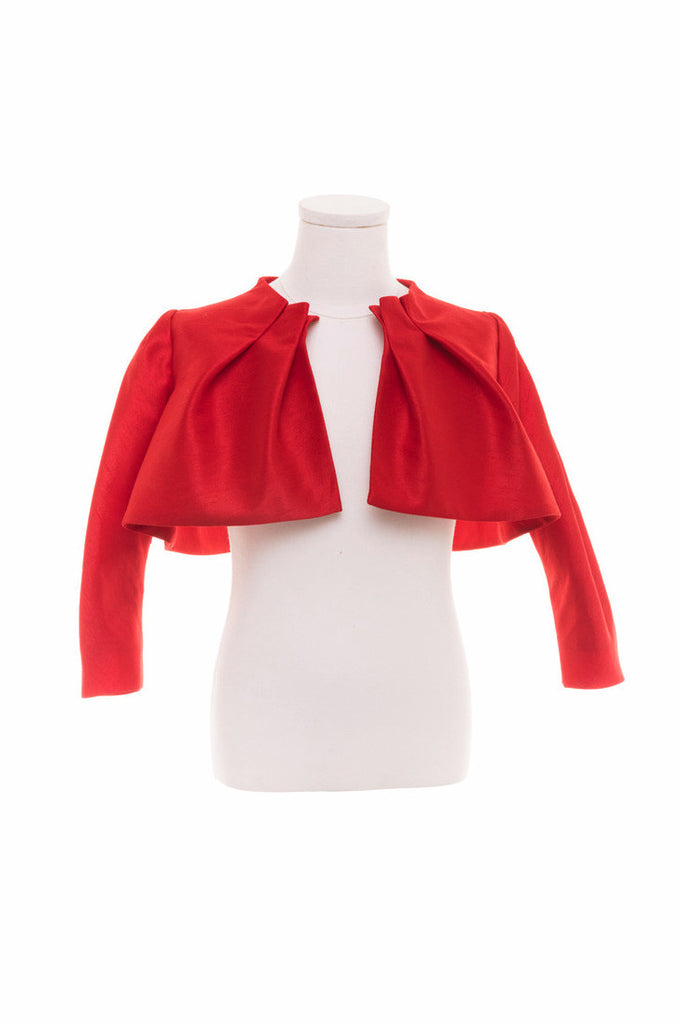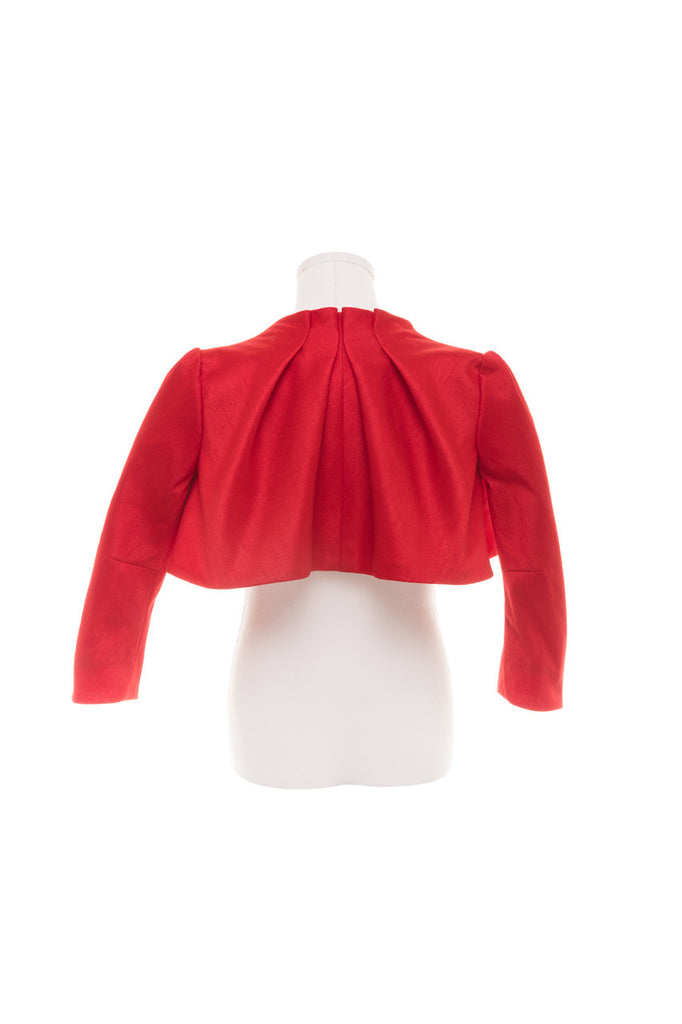 Red Shantung Cropped Jacket with Pleated Stand-up Collar and Narrow Long Sleeves.