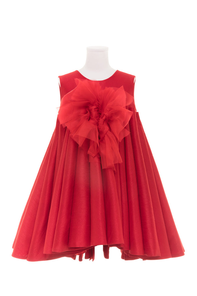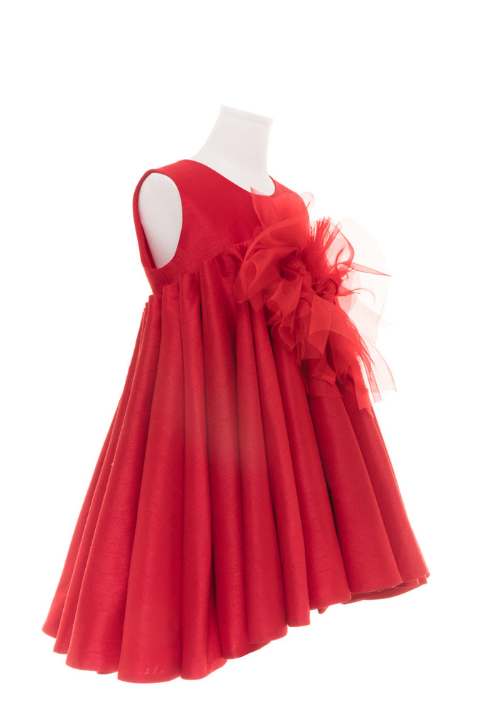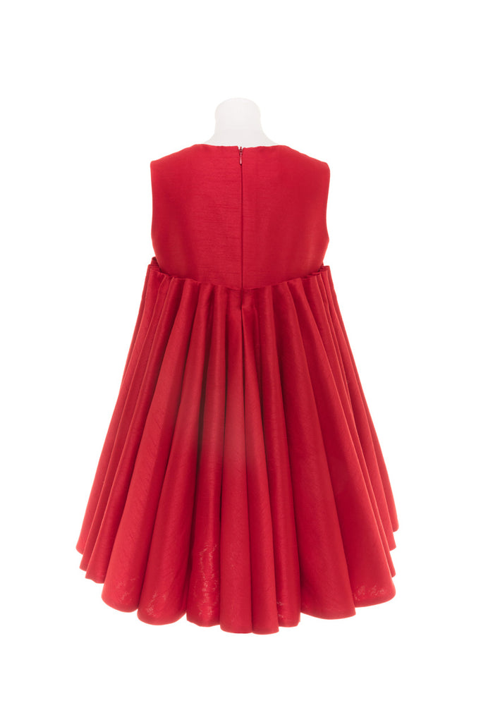 Red shantung bodice with an empire A-line skirt created with stacked-up vertical cones. The skirt has a high-low hem and hidden pockets.