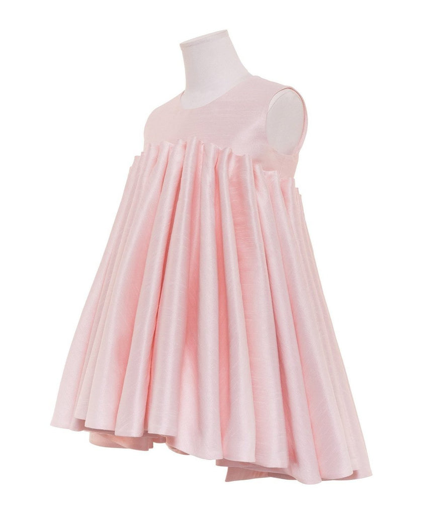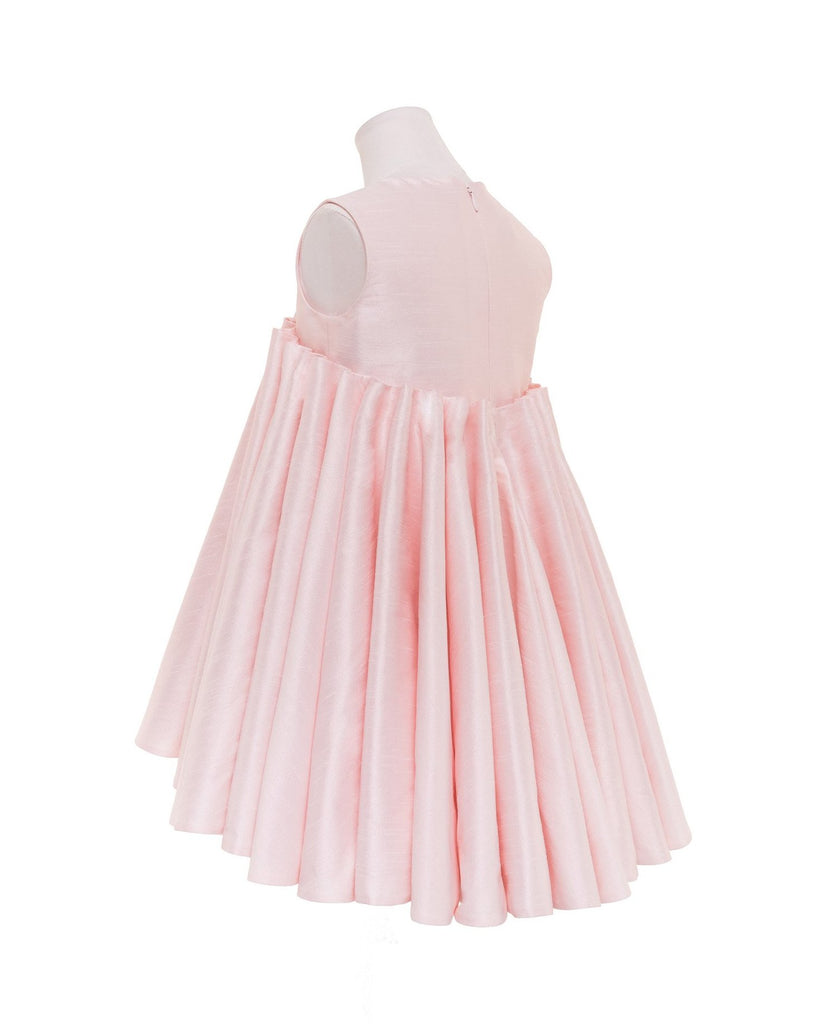 Powdered pink shantung bodice with an empire A-line skirt created with stacked-up vertical cones. The skirt has a high-low hem and hidden pockets.